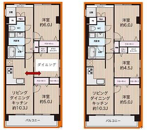 中古マンションの多くはリビングがバルコニーに面していません。この場合洗濯物を干す為に「夫婦の寝室」或いは「子供部屋」というプライベート空間を通らなけらばなりません。この不便さはリノベーションで間取りを検討する際先ず解消しようと考えるポイントです。 ![]()