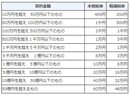 不動産売買契約書に貼付する印紙代です。契約内容によって契約書の原本を1つにして相手方はコピーを受領する売主買主折半、売主負担、買主負担、又原本を2通作成しそれぞれが全額を負担する方法がありますが、現状は原本を2通作成し、それぞれ自分の売買契約書分を支払うのが一般的なようです。現状令和4年3月31日まで軽減税率が適用されます。印紙税の金額は下記の表のようになります。