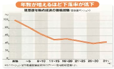 マンションのビッグデータによればマンションは築年数が15年位までに価格は新築時の50%位になり、その後は緩やかに減価していくとされています。減価するのは建物の価値なので、最後は土地の価値になっていきます。